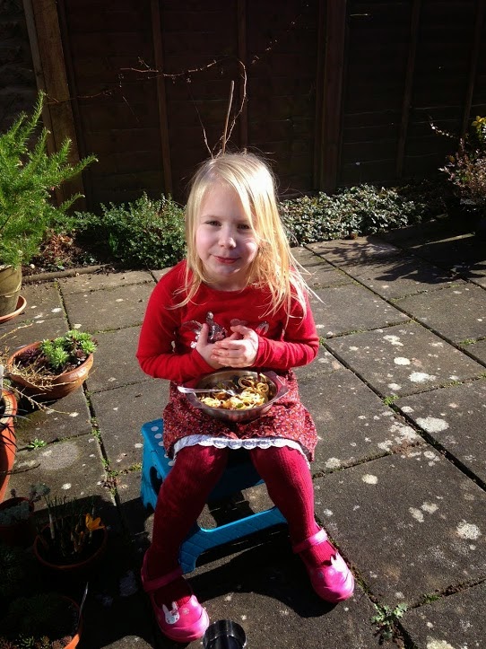 so Izzi had her lunch on the patio, then looked for pretty stones in the garden. 'Mum's' phone was taken down the garden, and pictures of the spring flowers taken. We found a hidden clump of snowdrops, and Izzi even noticed that we had different types growing in the garden.